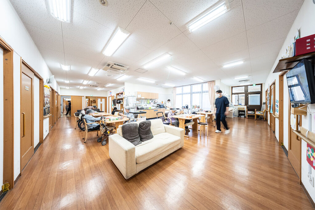 皆さんでゆったりと時間を過ごせるリビングと、一人一人が長年愛用した身の回り品を持ち込んで頂き、まるで自宅のような生活の提供をします。職員は決まったユニフォームがありません。入居者の皆さんと同じようにそれぞれが、それぞれの格好をして仕事をしています。